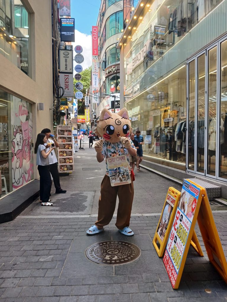 Her sabah önünden geçtiğimiz kafe, bu sabah yine çok kalabalıktı. “Burada mutlaka kahve içeceğiz.” diyerek kozmetik mağazalarının, hediyelik eşyaların satıldığı dükkânların yoğun olduğu sokaklarda gezip, sokak sanatçılarına kara kalem portremi çizdirdikten sonra Myeongdong Katedrali’ne geçtik.