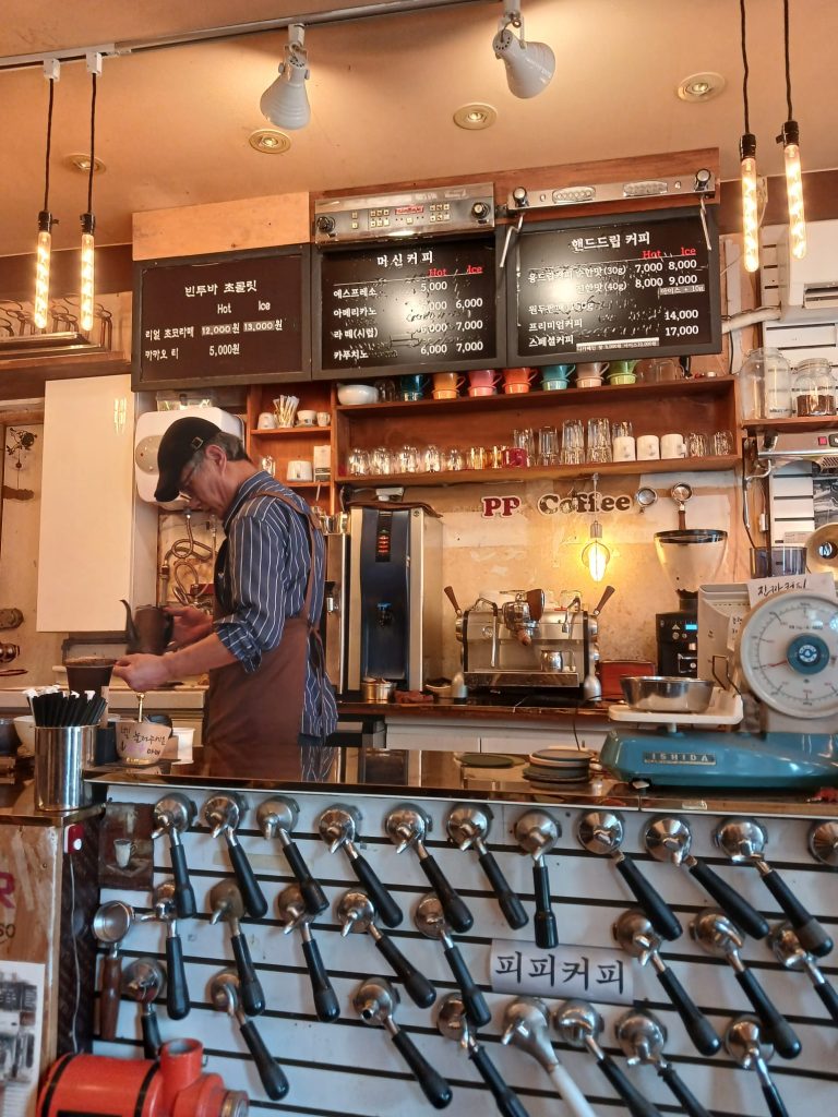 Günün sonunda, son gecemde, Mangwon’daki P.P Cafe’de kahve içtik. Küçücük mekânda kahve yapan beyefendinin sakinliği insana huzur veriyor. Kahvenizi yudumlarken adeta bir kahve müzesindesiniz.